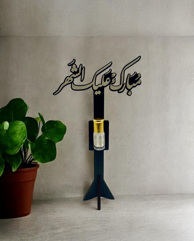 توزيعات رمضان عبارة عن ستاند خشب مع عبوة مسك، يحمل الستاند عبارة "مبارك عليك الشهر" ليكون بذلك من أجمل الهدايا الرمضانية البسيطة التي يمكنك تقديمها للأقارب والأصدقاء.