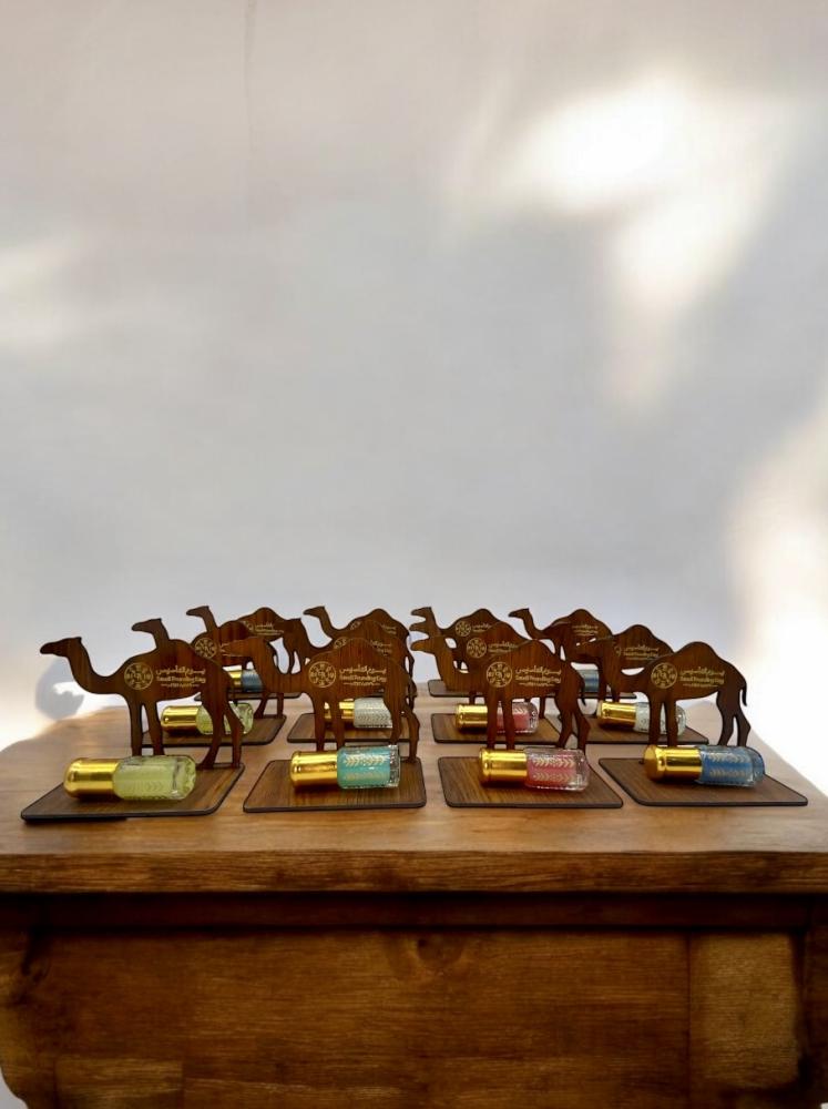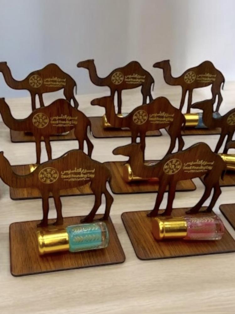 توزيعات ستاندات ليوم التأسيس، عبارة عن 12 ستاند خشبي صغير على شكل جمل، كل ستاند يضم ربع تولة مسك بروائح وألوان مختلفة!