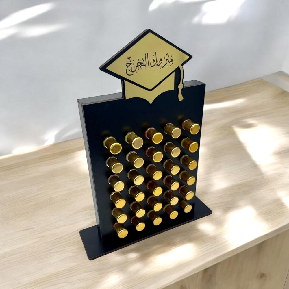 ستاند توزيعات تخرج فخم من الخشب المصنوع بدقة، مزوّد بقبعة تخرج من الأكريلك الذهبي تحمل عبارة "مبروك التخرج" بأسلوب أنيق. يحتوي على 30 خانة لوضع ربع تولات المسك ويُعدّ قطعة مميزة للاحتفالات والتوزيعات في حفلات التخرج. مثالي لمن يبحث عن توزيعات تخرج فخمة، ستاند تخرج بتصميم مميز، أو توزيعات مسك للتخرج.