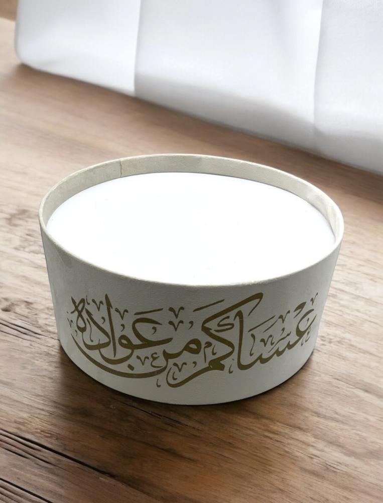 صينية ضيافة فاخرة لعيد الفطر مصنوعة من الخشب عالي الجودة وملبّس بالمخمل الأبيض، تصميم صينية الحلا على شكل اسطوانة بحواف مرتفعة مع طباعة عبارة عساكم من عواده باللون الذهبي على القماشة.