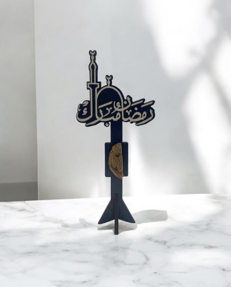 🟡 ستاند خشبي 🟡 عبارة "رمضان مبارك" 🟡 كسرة عود