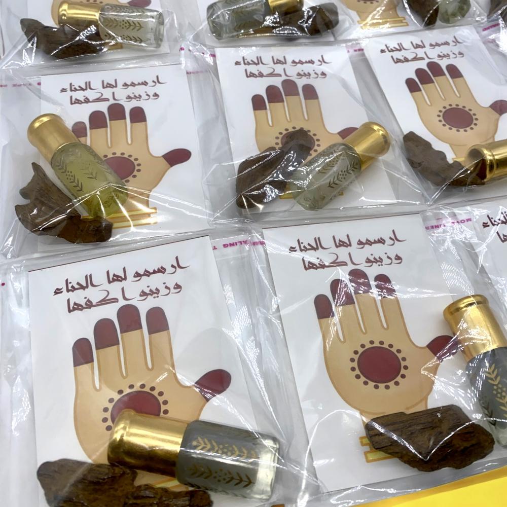 12 كرت تهنئة صغير مميز للزوجة، داخل كل كيس شفاف أنيق قطعة من عود فاخر وربع تولة مسك، ليكتمل العطر بالمعنى.
