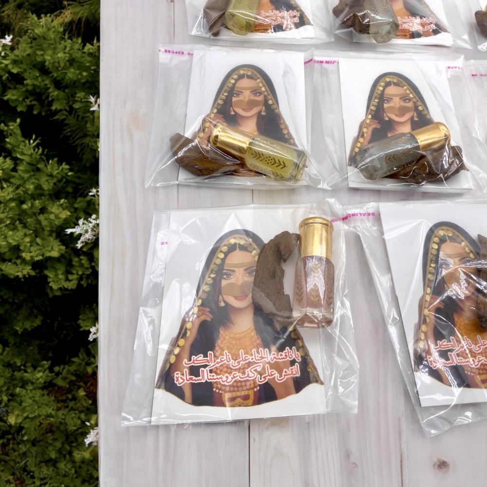 12 كرت تهنئة صغير مميز للزوجة، داخل كل كيس شفاف أنيق قطعة من عود فاخر وربع تولة مسك، ليكتمل العطر بالمعنى.