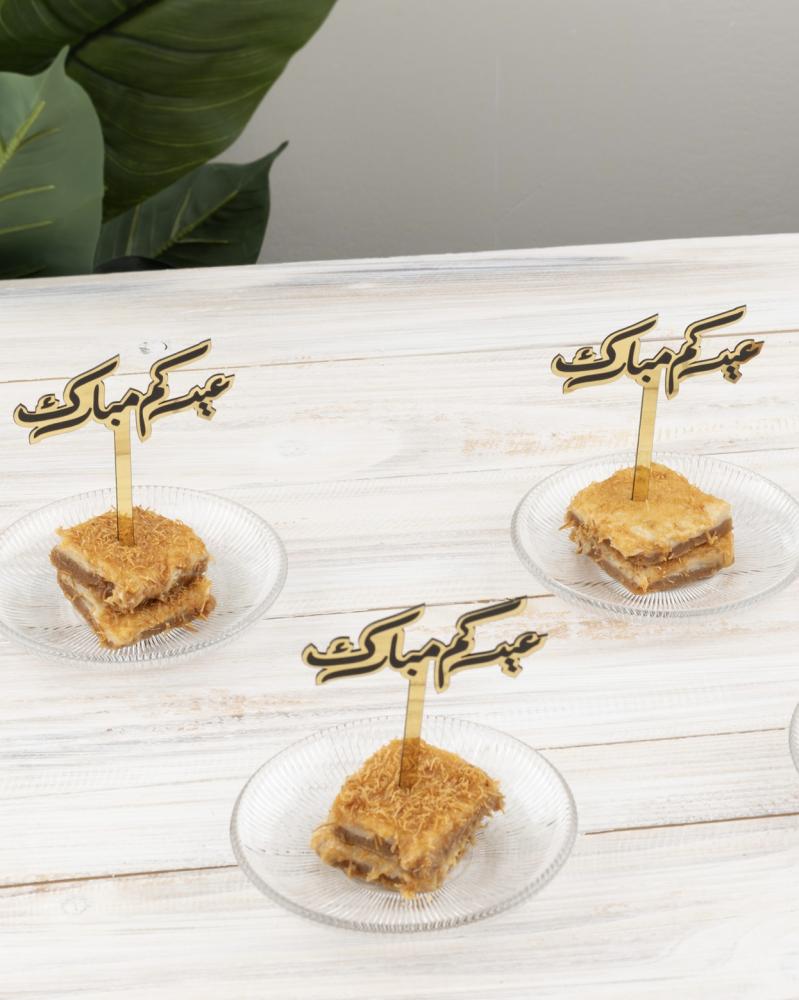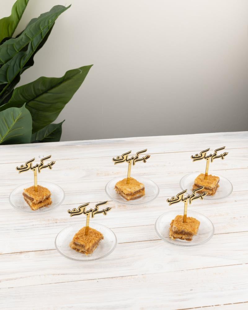 5 قطع تغريسات اكريليك للعيد باللون الذهبي المميز، مصممة وفق أبعاد مناسبة لكي تستخدم في تزين حلويات وضيافة العيد، كل تغريسة منها تحمل عبارة "عيدكم مبارك".