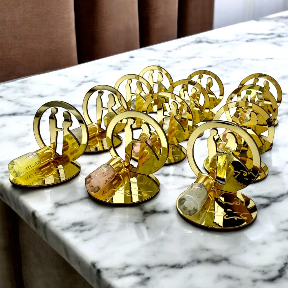 توزيعات زواج راقية وفاخرة بتصميم مميز على شكل عروس وعريس يمسكون بأيديهم، مصنوعة من الخشب والأكريلك الذهبي الفاخر، ومرفقة بربع تولة مسك عالي الجودة.
