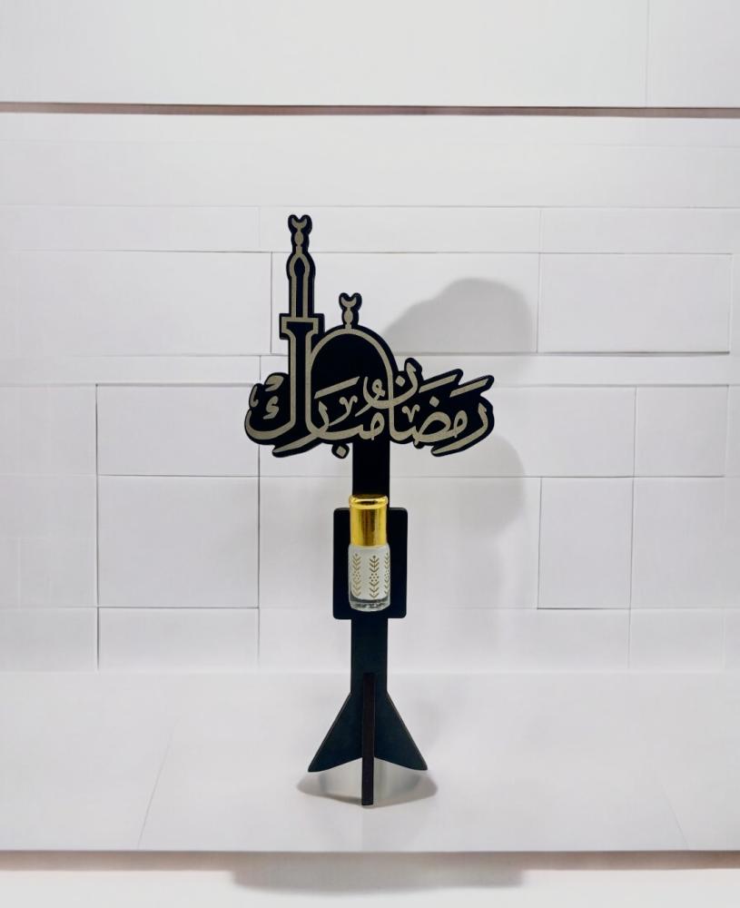 ستاند توزيعات رمضان خشبي مع عبوة مسك صغيرة، مناسب للتهنئة بحلول الشهر الفضيل لكونه يحمل عبارة "رمضان مبارك"، يمكنك اختياره كـ هدية بسيطة بمناسبة الشهر المبارك.
