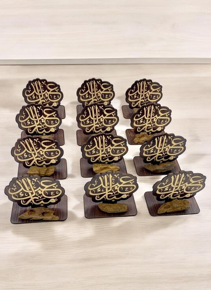 مجموعة ستاندات توزيعات عود للعيد عبارة عن 12 ستاند خشبي بتصميم مستوحى من روح العيد يحمل عبارة "عيد مبارك"، كل ستاند يأتي مع كسرة عود. يمكنك اختيارها كـ توزيعات العيد للعمل أو للأهل والأقارب.