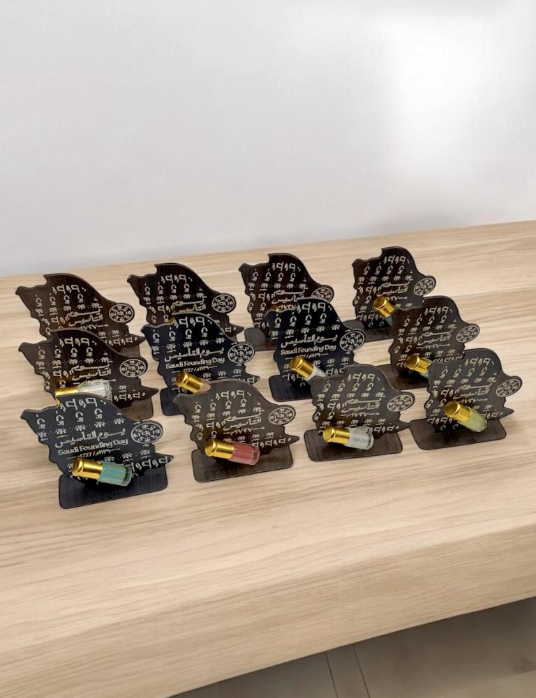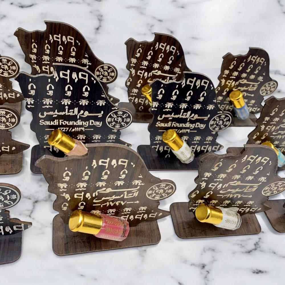 توزيعات مسك يوم التأسيس، عبارة عن 12 ربع تولة مسك صغيرة، كل منها مثبت على ستاند خشبي متين بتصميم خريطة المملكة مع نقوش ورموز وطنية، ليجمع بين فخر الانتماء ورائحة التراث العريق!