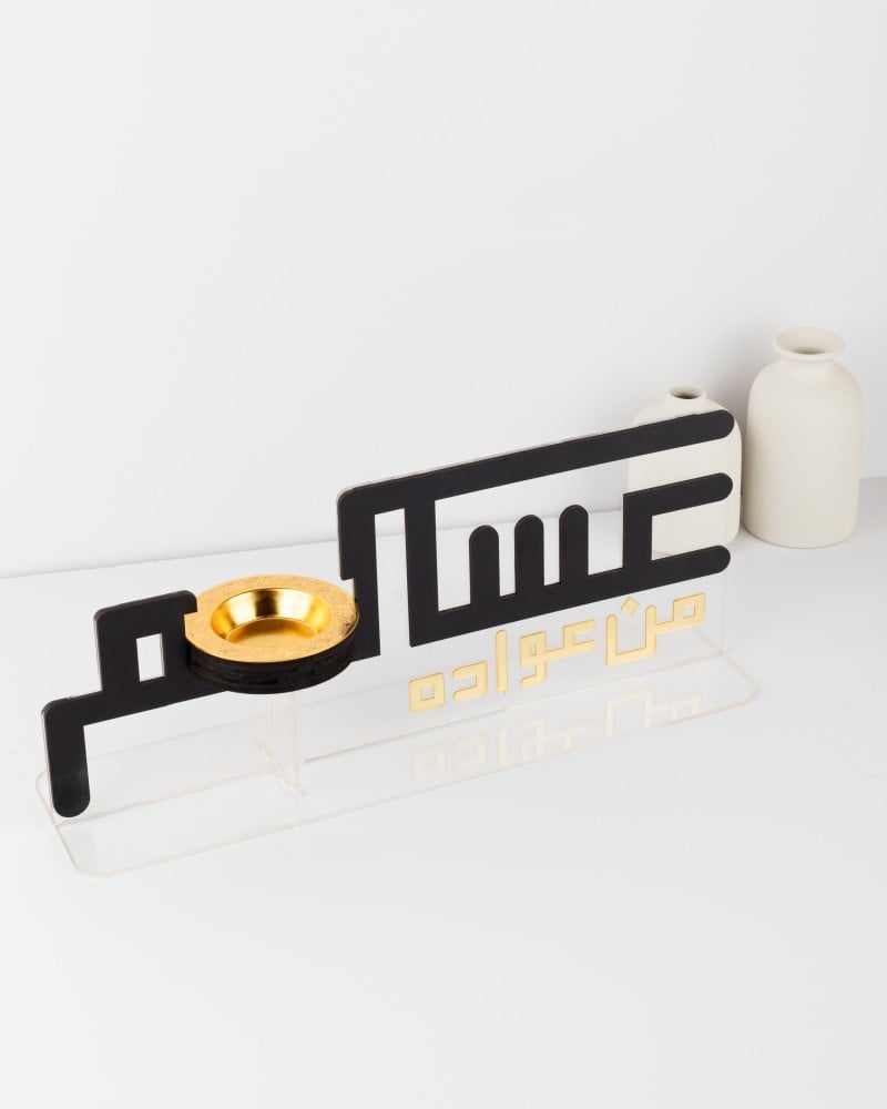 مبخرة عيد بتصميم على شكل عبارة "عساكم من عُواده"، مصنوعة من الخشب والأكريليك الذهبي، مع ستاند لرفعها عن مستوى الطاولة من الأكريليك الشفاف. القطعة المعدنية الذهبية مخصصة لإشعال البخور لتعطّر به جو منزلك.